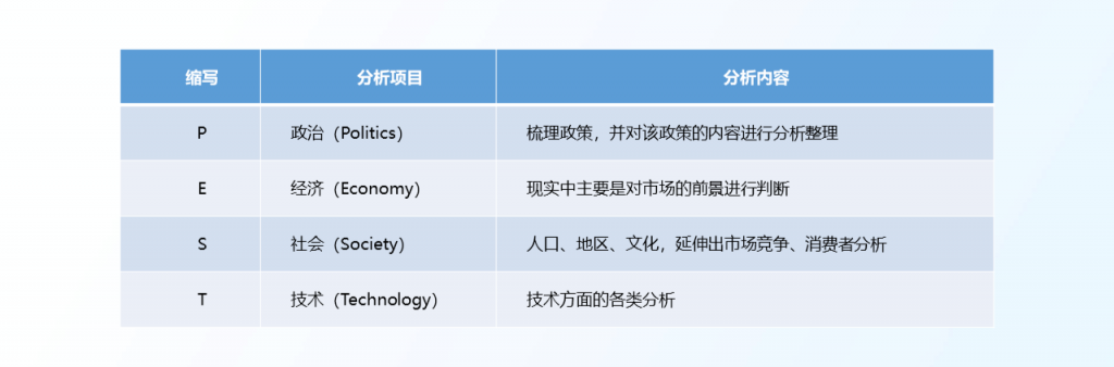 市场环境分析主要通过PEST分析实现,该分析是一种宏观环境的分析方法,主要用于企业外部环境分析。