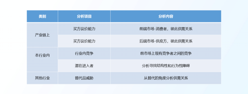 对于市场竞争能力和竞争格局的分析,一般是通过“波特五力模型”实现。该模型是由哈佛大学教授迈克尔·波特在1980年提出的一种分析企业竞争环境的工具,它包含了五个关键因素。