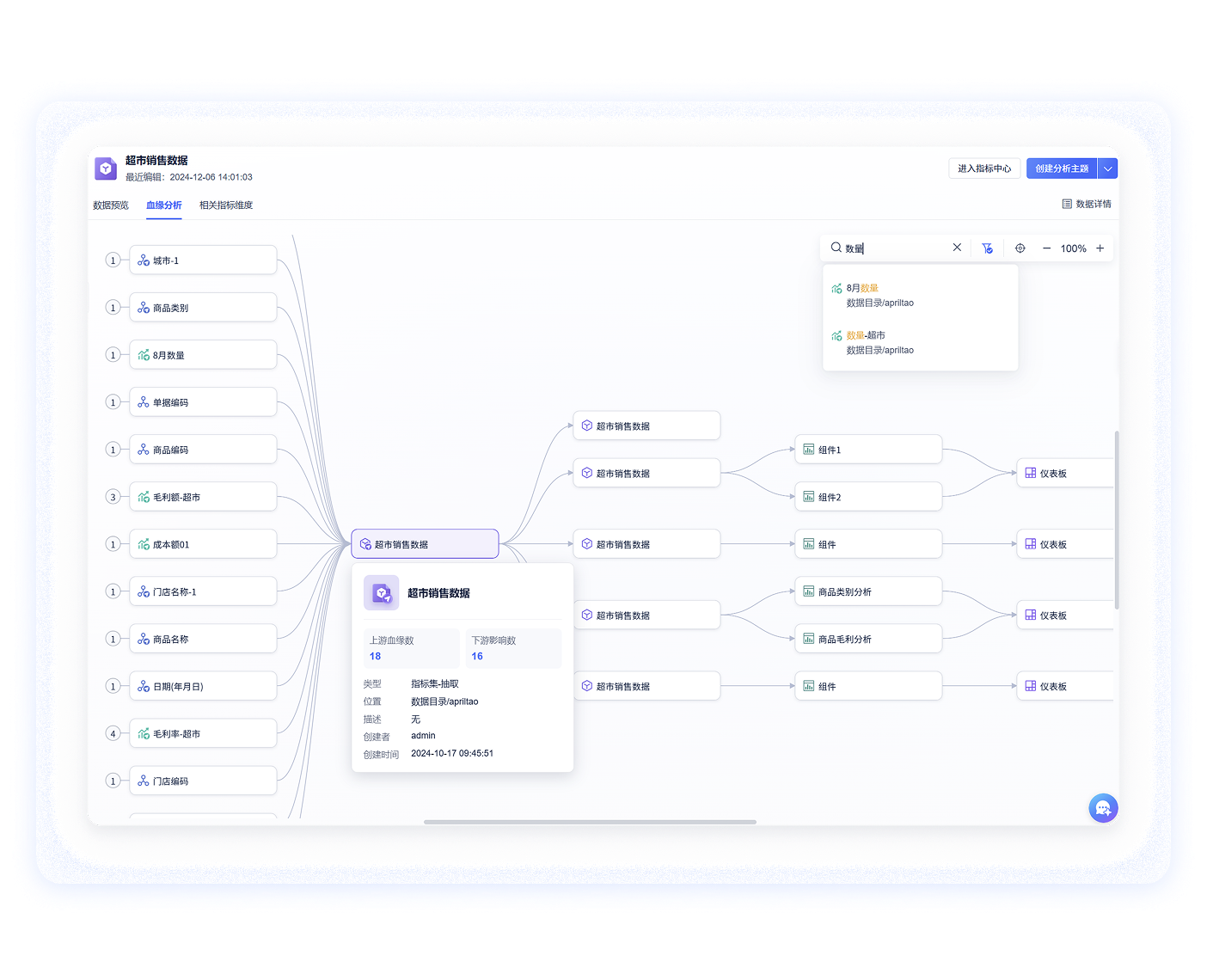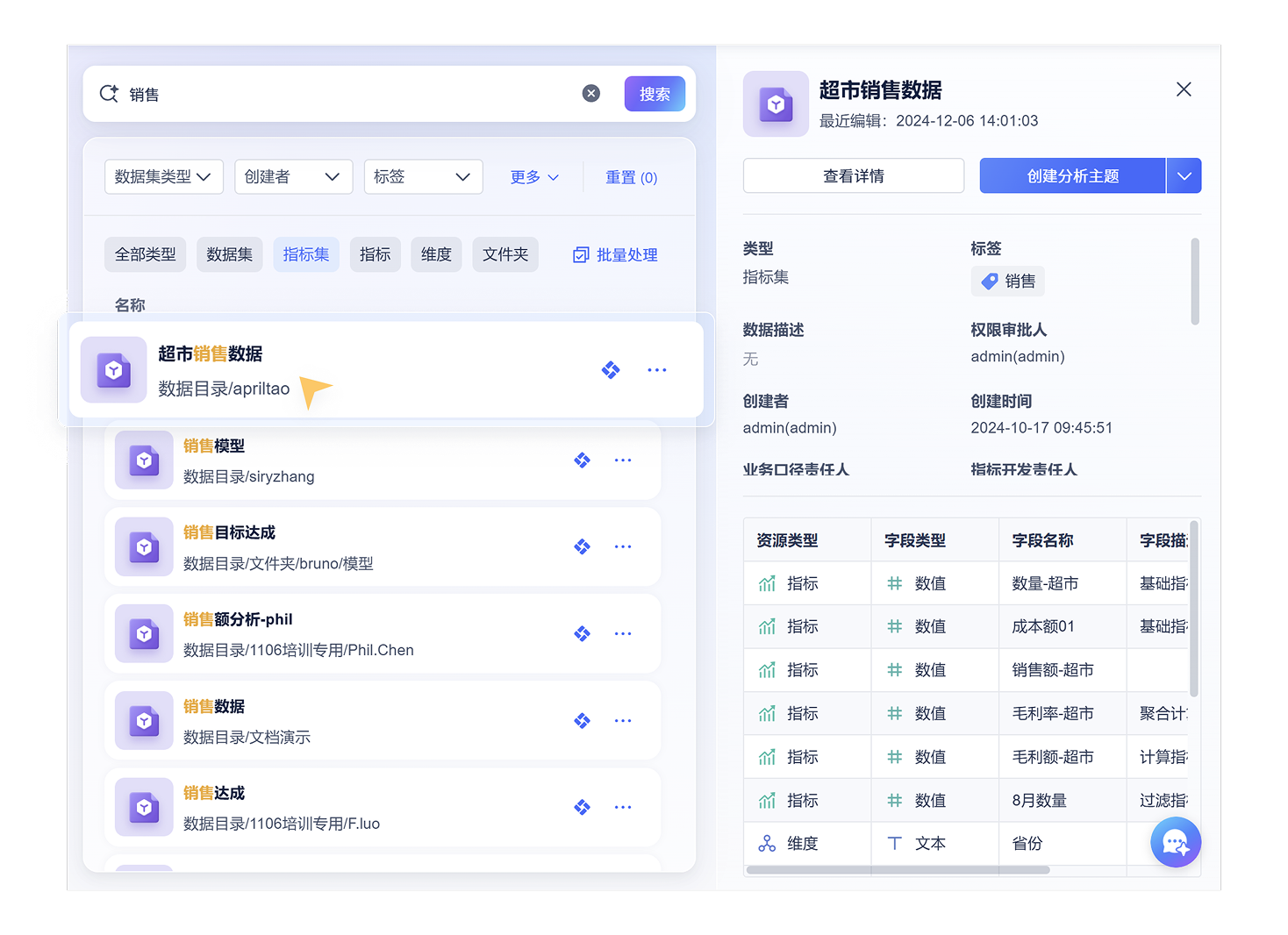 当指标直接服务于企业经营管理和业务决策时才能充分发挥价值,停留在数据治理平台里的指标难以被业务用户理解、难以被管理者看到,因此必须再转化为数据表、指标卡、看板才能被用于分析,FineBI打通了指标平台和分析平台,让指标分析的链路更简短,从而充分发挥指标建设的价值。
