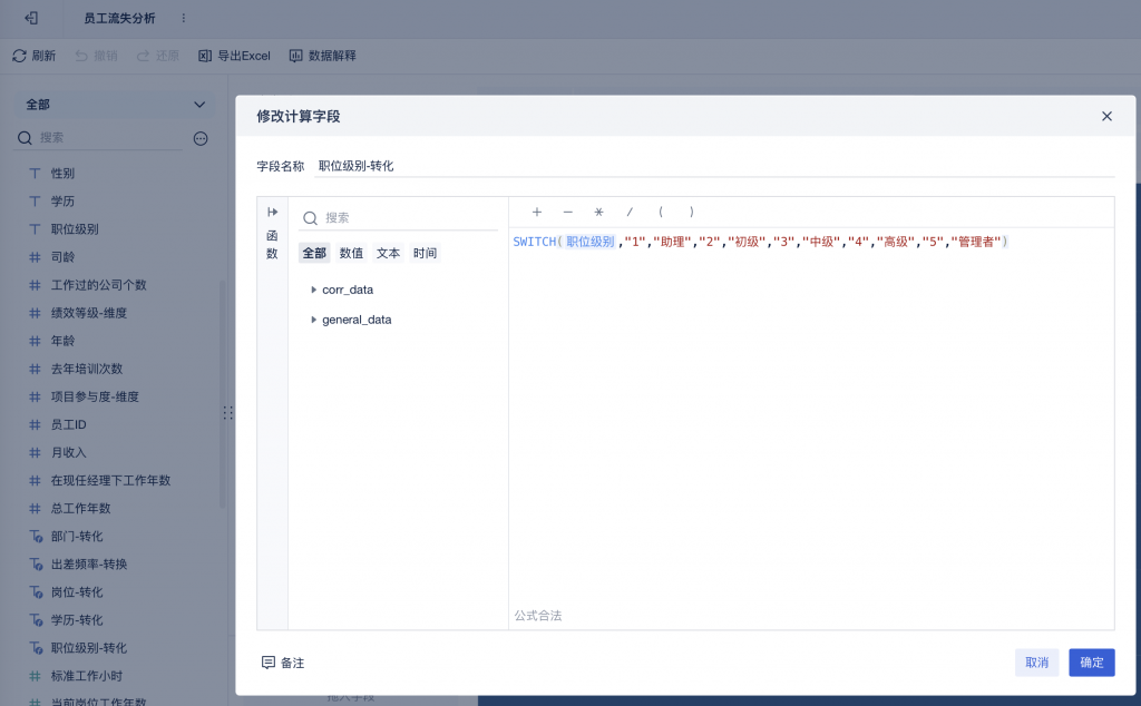 2)对包含数值代号的字段进行转义:含学历、职位级别、工作满意度、工作关系满意度、工作环境满意度、工作生活平衡度、工作参与度、绩效评价。