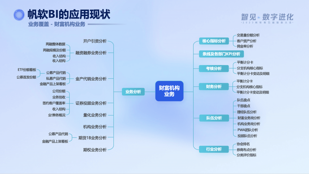 借助财机BI数据分析平台,财机分支机构管理部业务管理组不仅将方正一直以来的组织管理考核方式“搬”到了BI上,还进行了进一步的细化拆解——核心指标分析、条线及各部门KPI分析、考核分析、财务分析、队伍分析、行业分析、业务分析7大模块,从绩效到业务再到团队,最后渗透到每一个分支机构。不仅实现了业务发展看时点、看趋势,内部管理看变化、解结构,还做到了向外看市场、比同业,全方位多维度多视角进行业务剖析,让数据分析应用真正做到赋能每一个组织单元、每一个管理层级,甚至每一个业务,真正做到财机上下思想一致、目标一致、行动一致。