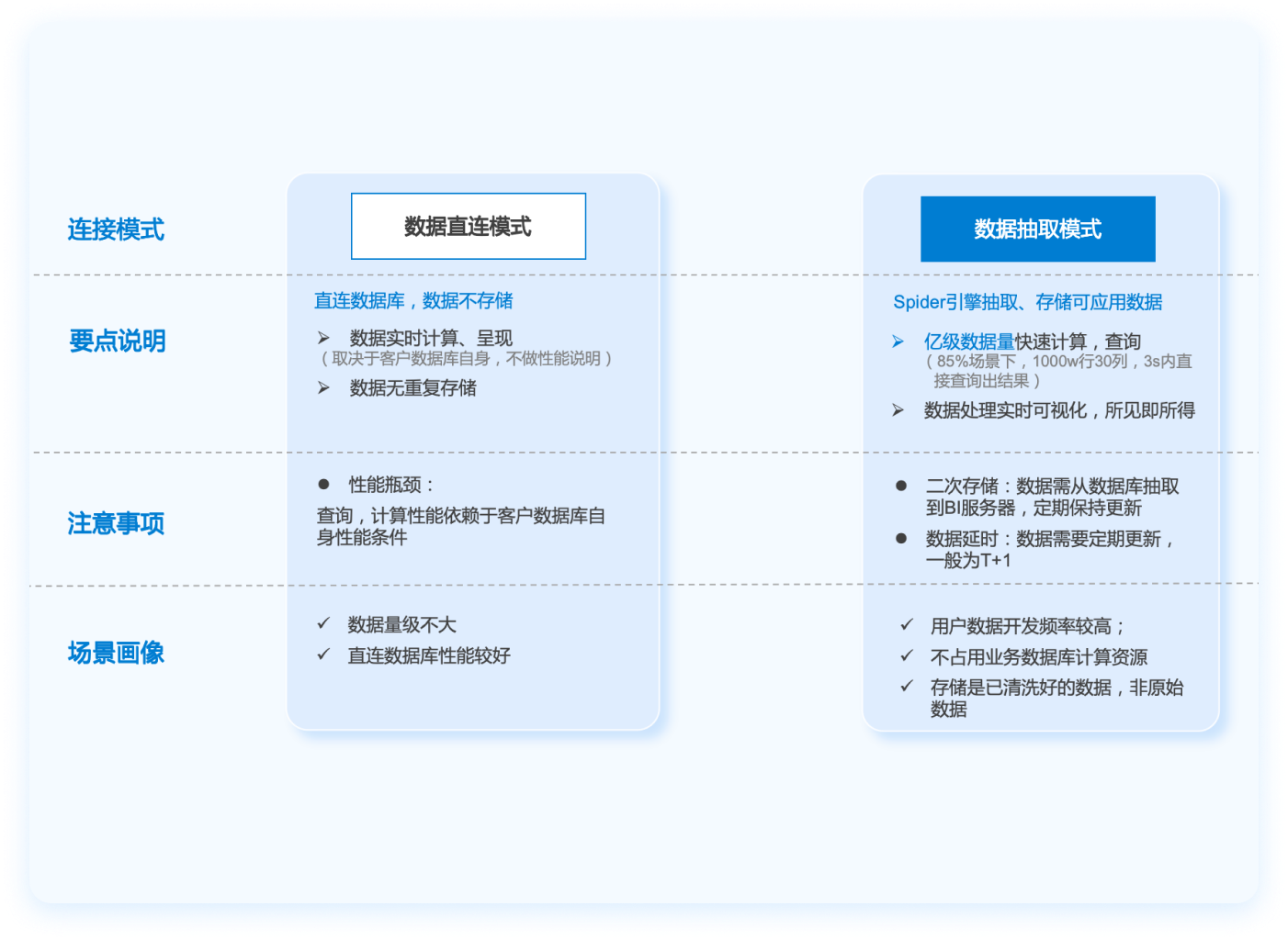 基于帆软自研引擎的直连模式和本地模式,可支撑Bl数据分析的各种应用场景