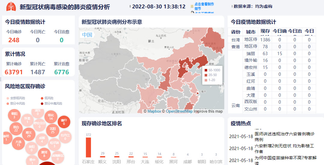 使用 Finebi软件,利用内置数据制作了疫情监控看板,包括全球疫情看板和中国疫情看板。其中全球疫情看板内容包括疫情统计数据、疫情分布、疫情确诊国家排名、全球疫情累计,通过看板即可监控疫情发展情况,中国疫情看板在此基础上增加了风险地区现存确诊、疫情热点。
